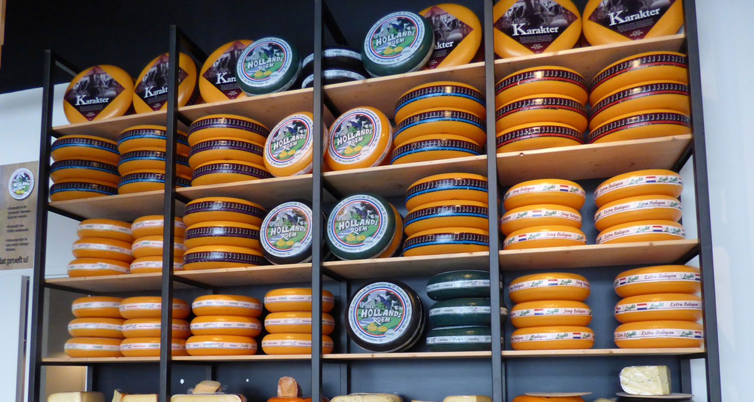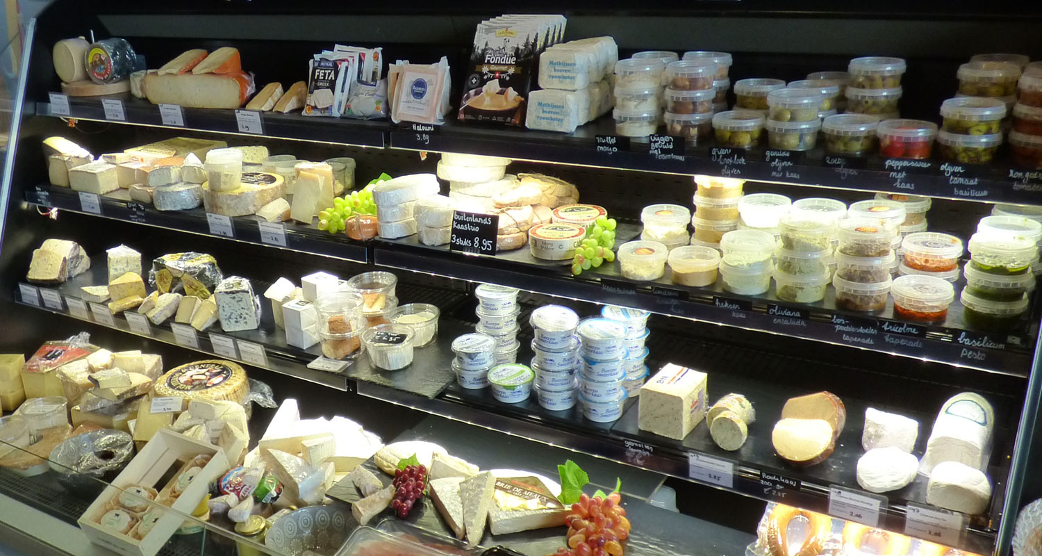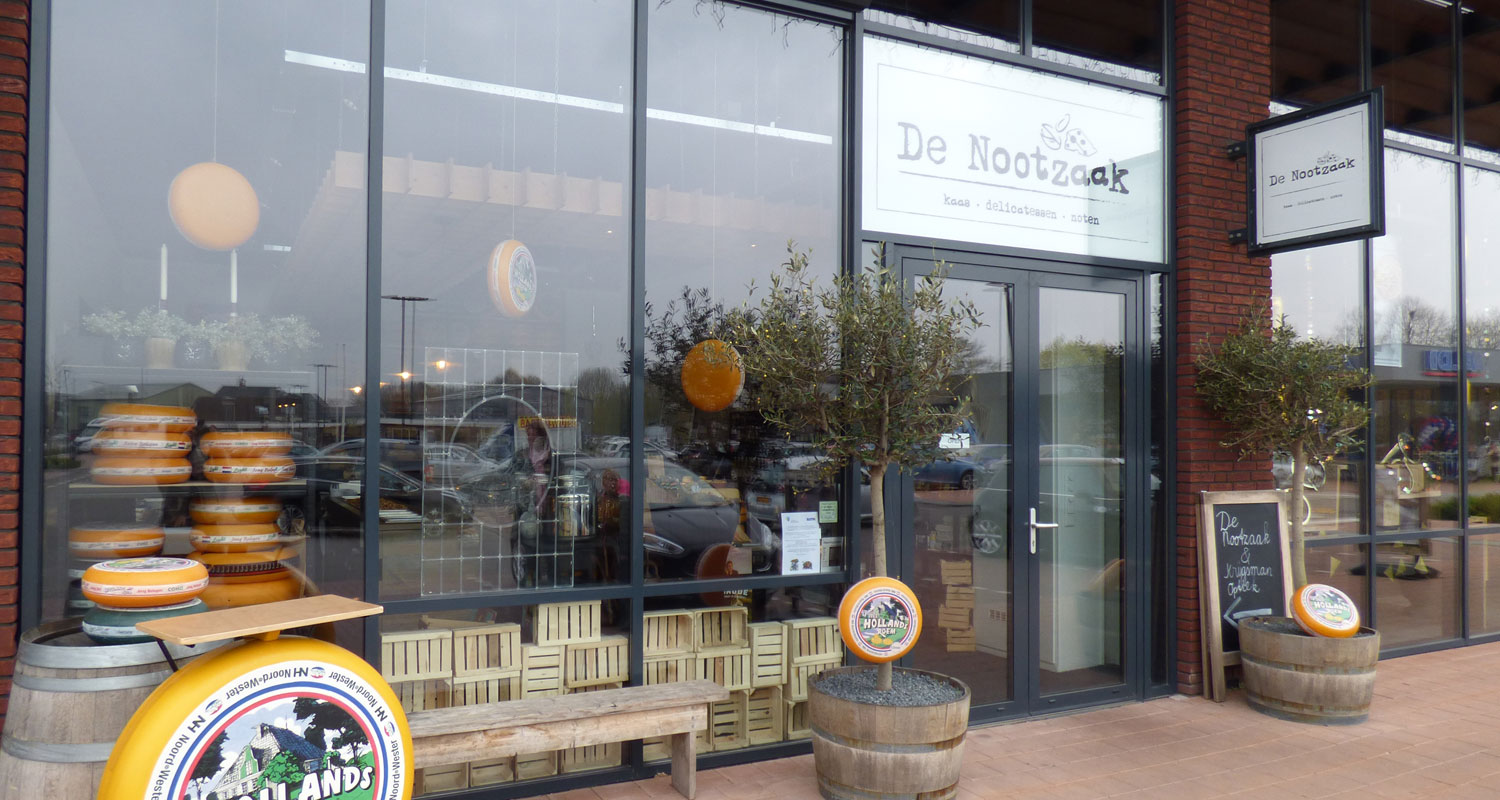 Een winkel met Hollandse en Buitenlandse kaas, vers gebrande noten en verschillende delicatessen.